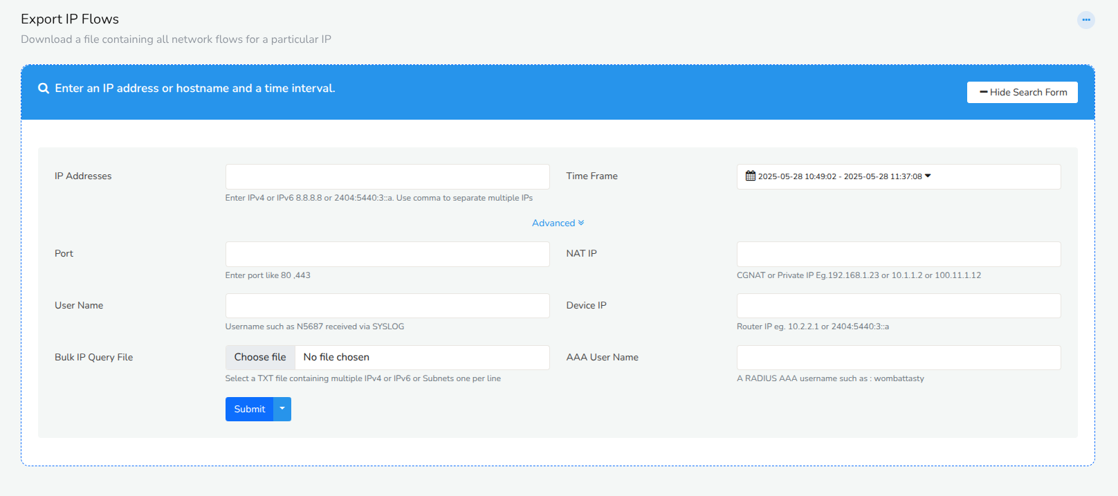 Bulk IP Query File | (.txt file) | A .txt file containing multiple IP addresses or subnets for bulk IPDR queries. |